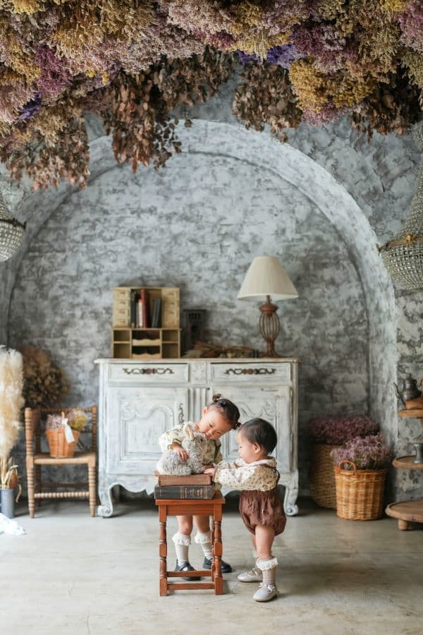 アンティークの質感とドライフラワーのやわらかな色合いに、