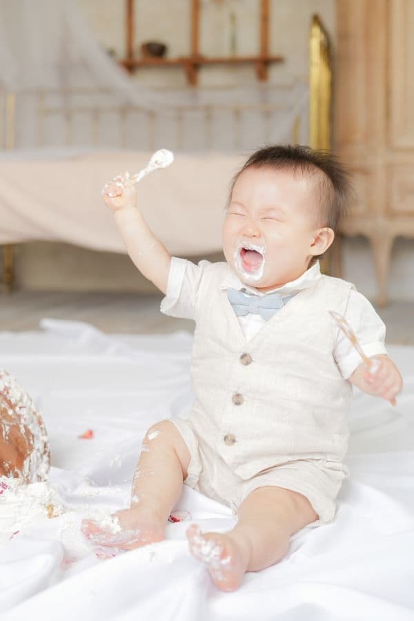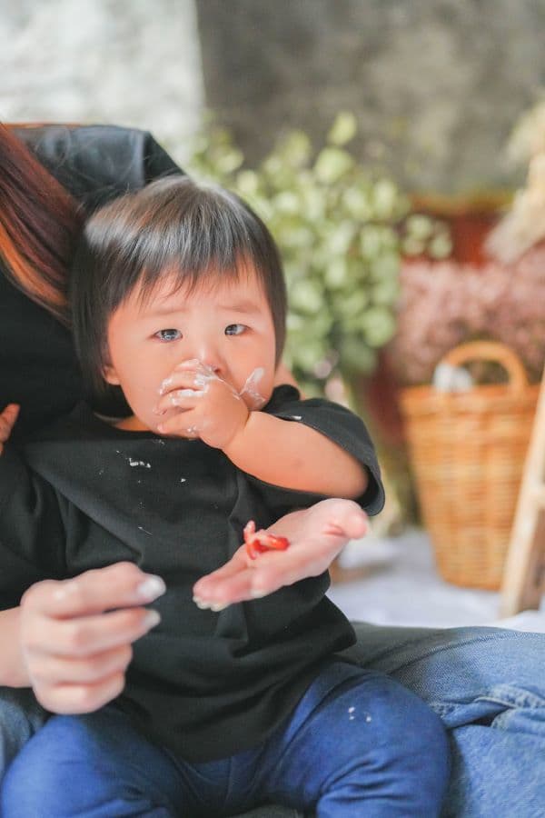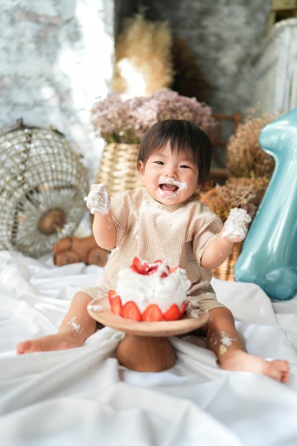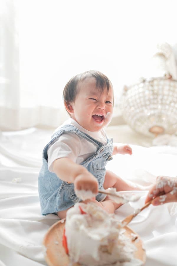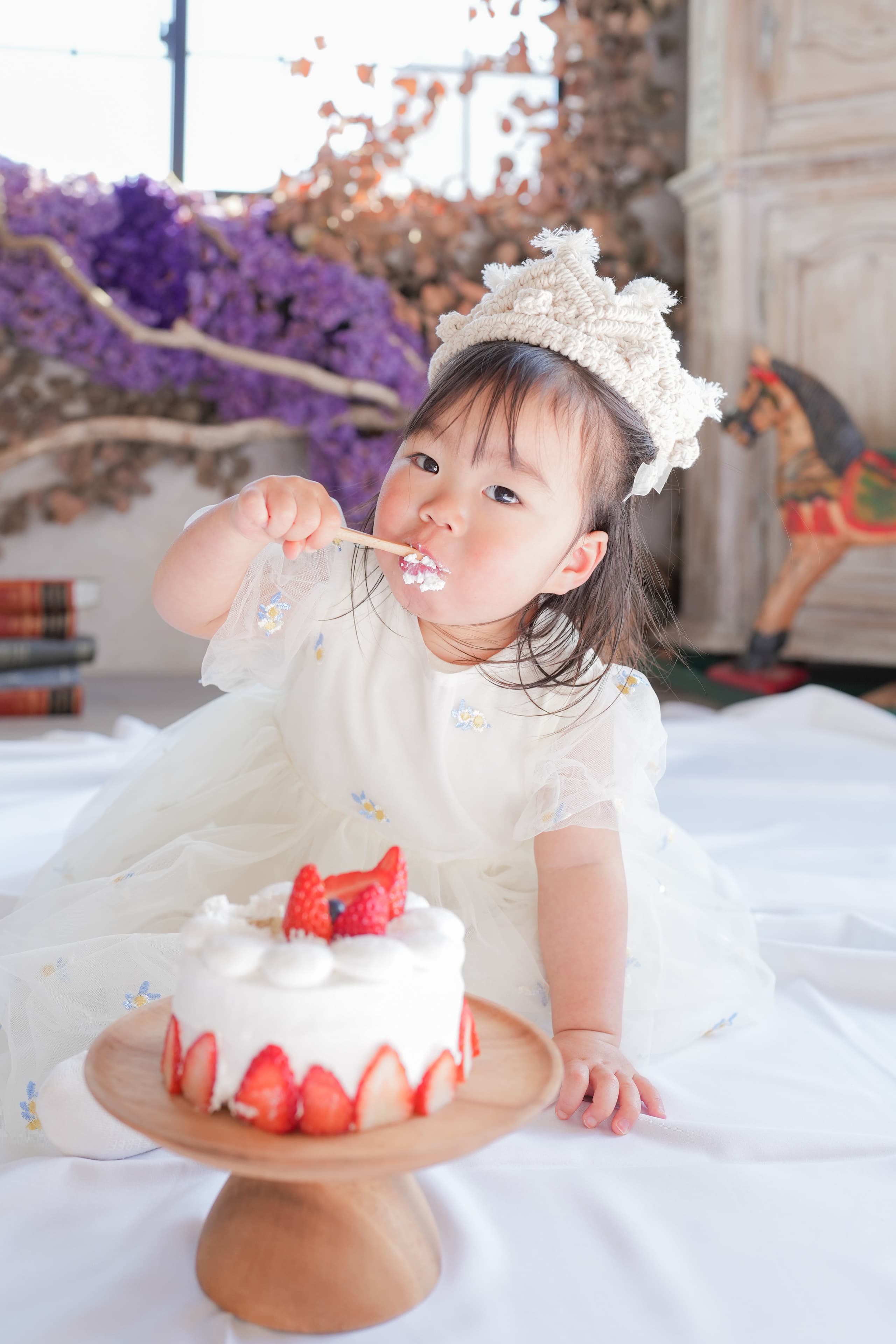ご安心ください。初めて見るケーキに驚いて、固まってしまうお子様もいらっしゃいます。無理に食べさせようとせず、まずは指先で触ってみたり、パパやママが一口食べさせてあげたりしながら、その子のペースで進めていきます。そんな「不思議そうな表情」も、素敵な思い出の一枚になります。