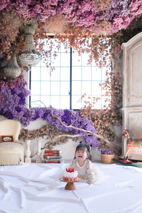 自然光がやわらかく差し込むアンティーク調のフォトスタジオ。一生に一度のスマッシュケーキが、映画のワンシーンのような“絵になる時間”へと変わります。こだわりの空間が、お子様の表情をよりいっそう引き立てます。