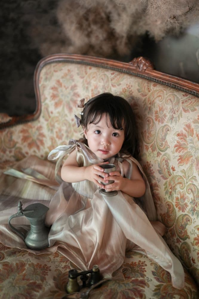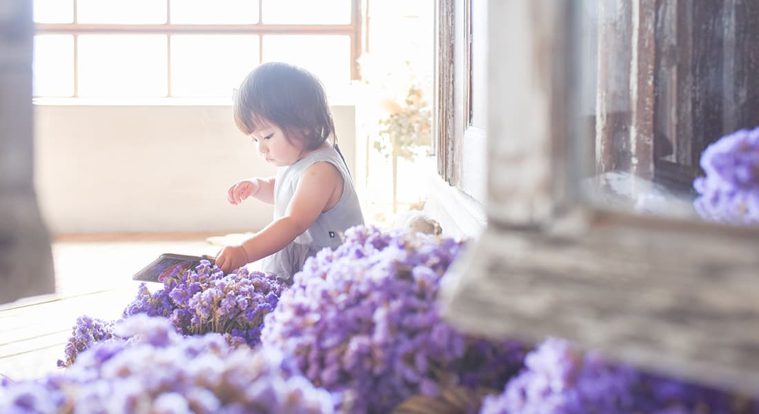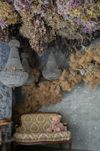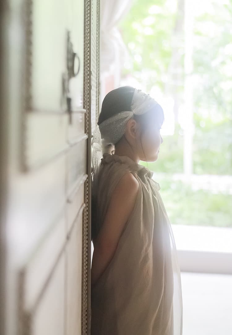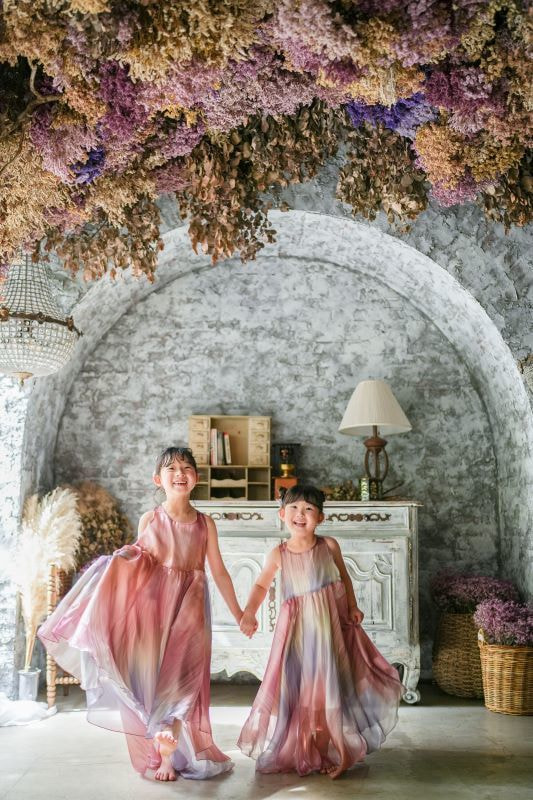 優しい自然光と本物のドライフラワーで、さまざまな表情の写真を撮影。